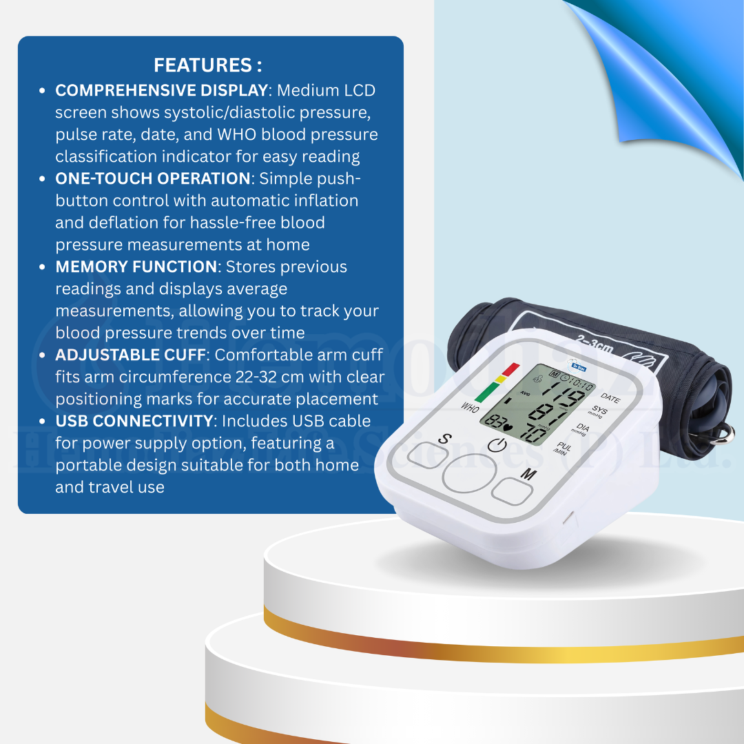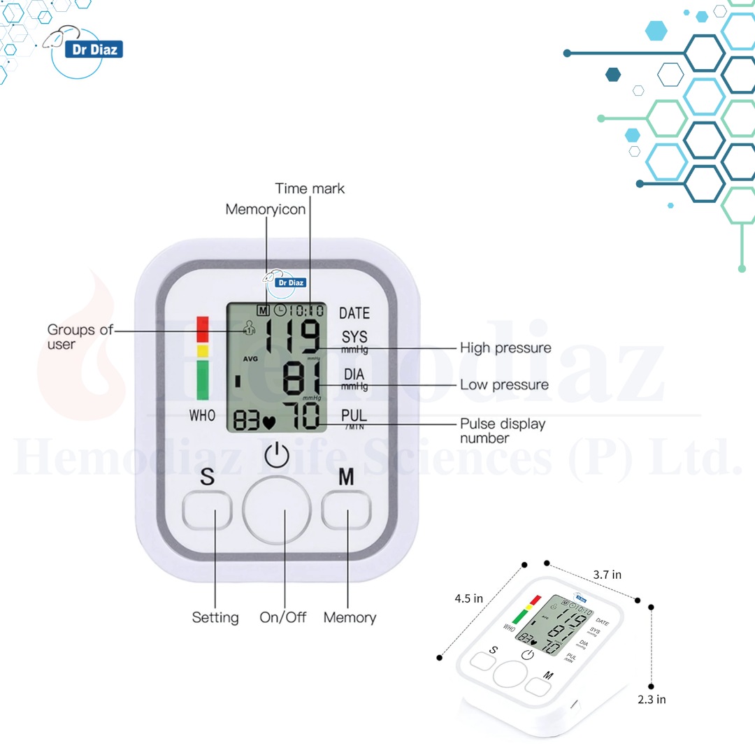 The Dr Diaz BP80 Automatic Digital Blood Pressure Monitor is designed for clinical, hospital, and home use with high accuracy to ensure reliable readings. It features an easy-to-read liquid crystal display (LCD) for quick and clear results of systolic and diastolic blood pressure along with pulse rate. The automatic cuff inflation ensures comfort, while the advanced measurement technology provides consistent and accurate results every time. This monitor is equipped with one-touch operation for convenience, making it ideal for both professionals and personal use. With a 1-year warranty, it offers peace of mind and long-term durability.