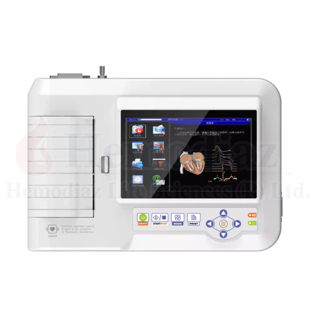 The Dr Diaz ECG Machine 600G is a 6-channel ECG device designed to provide reliable heart rate monitoring and electrocardiogram (EKG) interpretation for healthcare professionals. This portable and user-friendly machine is ideal for clinics, hospitals, and medical institutions, offering real-time heart health data for accurate diagnosis and early detection of cardiac issues. Equipped with advanced interpretation technology, the 600G provides detailed insights into heart rhythms, helping in the detection of arrhythmias, heart attacks, and other cardiac conditions. Its 6-channel display ensures clear and concise ECG patterns for effective monitoring. The device supports easy connectivity and instant data retrieval, making it an essential tool for medical professionals to assess heart health across a wide range of patients.